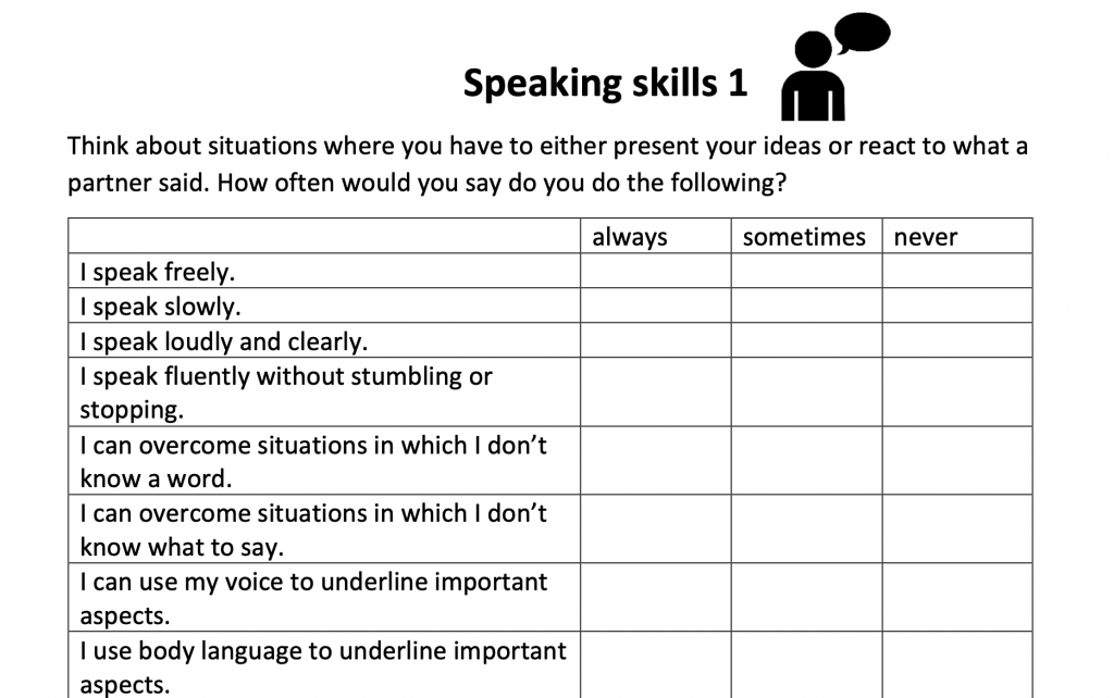 Je nach Zieltextgenre ergeben sich unterschiedliche Übungsbedarfe. So stehen bei der Aufnahme eines Podcasts im physical sehr stark die Stimme und die Prosodie im Fokus, sodass sich ein entsprechender language loop zu diesen Aspekten lohnt. In jedem Fall empfehlenswert ist eine gründliche Diagnostik. Wir haben hierzu zu Beginn des Unterrichtsvorhabens einen allgemeinen Einschätzungsbogen zu speaking skills (später auch zu listening skills) herausgegeben und darüber diejenigen Aspekte identifiziert, die viele Lernende als herausfordernd erleben. Für ein ökonomischeres Vorgehen könnte dieser Bogen auch digital bereitgestellt werden. Im Verlauf der Reihe weicht dieses allgemeine Raster den mit den Lernenden ko-konstruierten Kriterienkatalog, welcher im assessment cycle genutzt wird.