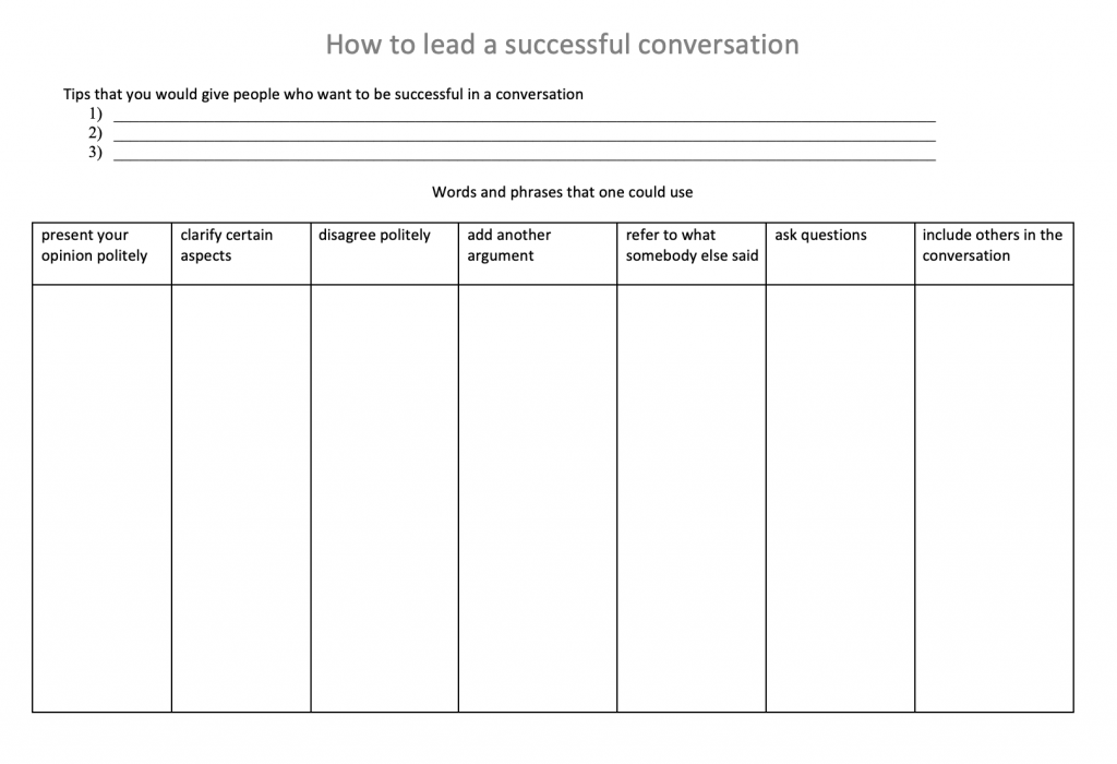 Ein Beispiel für einen language loop zum linguistic strand dient dem Aufbau eines thematischen, genrespezifischen Vokabulars zum Thema leading a successful conversation (z.B. als Teil eines Planungsgesprächs). Auf Basis eines geeigneten Modelltexts (z.B. eines politischen Podcasts) können die Lernenden den Wortschatz induktiv erarbeiten und die Tabelle als Basis für die Gestaltung eigener Diskussionen nutzen, oder diese einsetzen, um Feedback zur Nutzung der gesammelten words and phrases ihrer Mitschüler*innen zu geben.