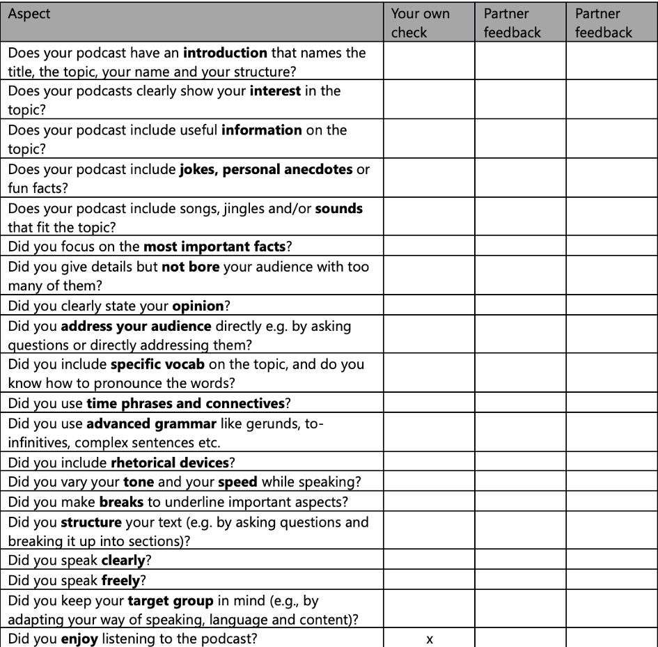 - Kriterien entwickeln: In unserer empirischen Studie hat es sich als sehr gewinnbringend erwiesen, die Lernenden aktiv in den Prozess der Entwicklung von Kriterien zur Beurteilung des Lernprodukts und sogar der mündlichen Kommunikationsprüfung einzubeziehen (Ko-Konstruktion). Dies erfolgt im Rahmen der Arbeit mit Modelltexten. Die Lehrkraft sollte dabei jedoch die Endredaktion übernehmen, d.h. die Kriterien gründlich revidieren und in einer Checkliste zusammenführen. Wie die Abbildung unten zeigt, wurden die Kriterien zur Erstellung eines Podcasts zunächst recht allgemein abgefragt (“What makes you listen to a podcast?”) und auf einer TaskCard gesammelt. Die ersten Ideen der Lernenden dienten dann als Basis für ein Unterrichtsgespräch zur Konkretisierung der Kriterien (“What do you mean by ‘interesting topic’?”).