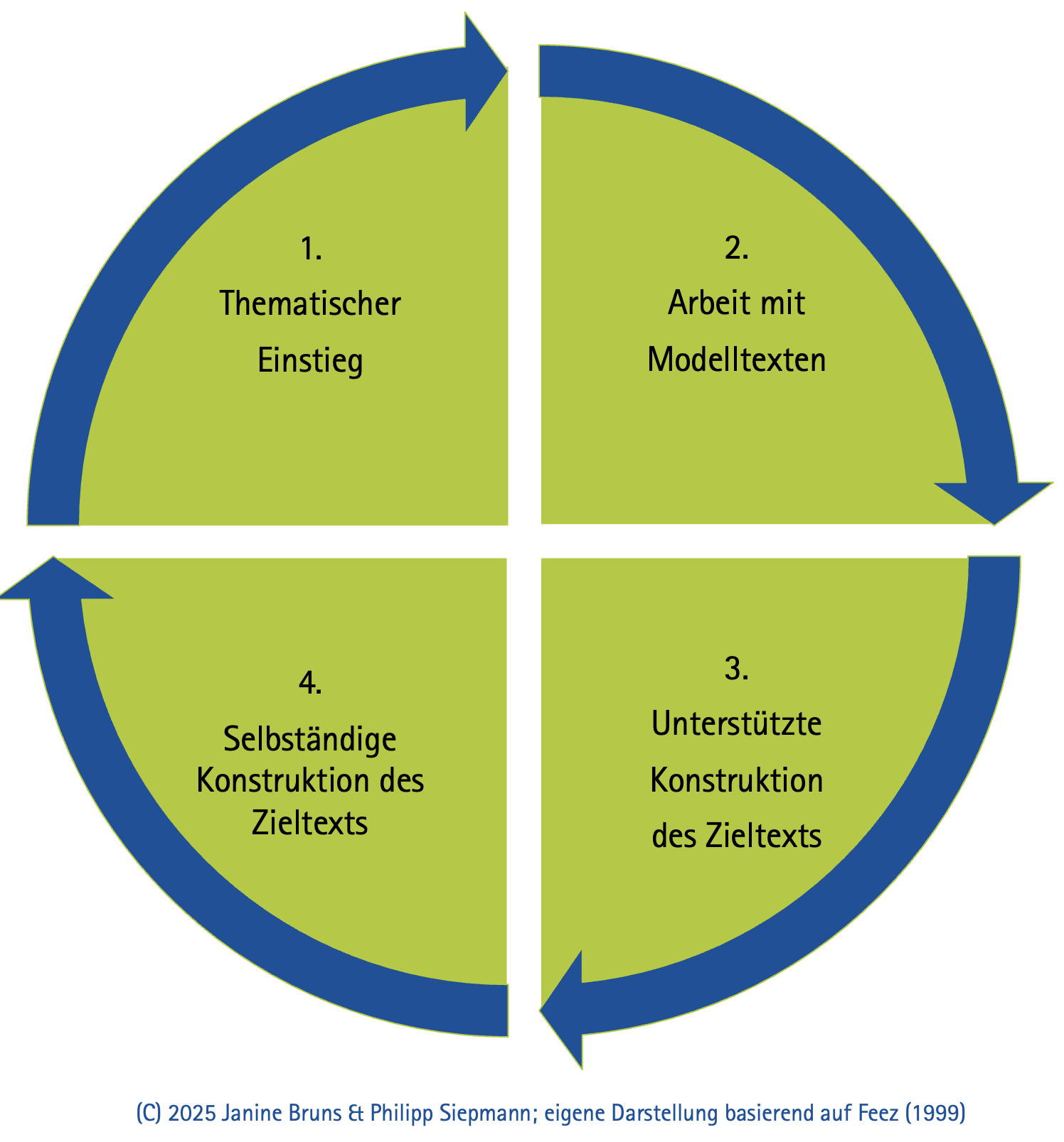 Der learning cycle lehnt sich an die ersten vier Phasen des teaching-learningcycle des generischen Lernens nach Feez(1998) und seinen Adaptionen von Hallet (2011, 2015) an. Generisches Lernen basiert auf der Annahme, dass Kommunikation in weiten Teilen konventionalisiert ist, d.h. abhängig vom kulturellen und sozialen Kontext in wiederkehrenden sprachlichen, stilistischen und strukturellen Mustern verläuft. Zum Beispiel folgt ein Small Talk einer Abfolge von einem Einstieg („Hi, how are you doing?“ – „Fine, how are you?“), einem Austausch über unverfängliche Themen und einem Abschluss („Well… I gotta hurry – see you soon!“). Wenn Lernende sich mit diesen Mustern vertraut machen, können sie Routinen entwickeln, die die kognitive Belastung bei der anspruchsvollen mündlichen Kommunikation reduziert. Darüber hinaus weckt die Auseinandersetzung mit Genres ein Bewusstsein für die Merkmale und Besonderheiten mündlicher Sprache gegenüber der Schriftsprache.